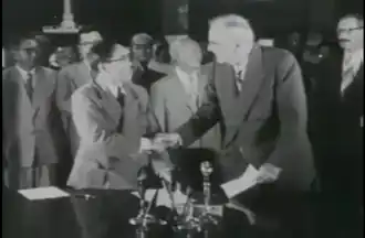![]() On August 8, 1953, Foreign Minister Byeon Yeong-tae and US Secretary of State John Foster Dulles shared a handshake after signing the treaty. Watched by President Syngman Rhee. | |