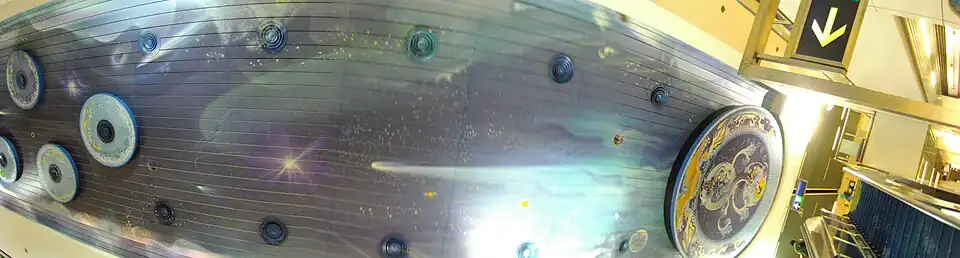 Since Line 2 of the Nanjing Metro is centered on Chinese traditional festivals, the theme of this station's decorations is the Qixi Festival.[4] At 700 m2 (7,500 sq ft), It features the largest painting area of any Line 2 station,[4] if not the entire Nanjing Metro system. Several traditional romance stories can be seen if one looks up at the ceiling, such as Niulang and Zhinü, Houyi and Chang'e and so on.[5]