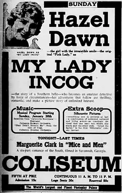 My Lady Incog is a 1916 American silent film produced by Famous Players Film Company and distributed by Paramount. It was directed by Sidney Olcott with Hazel Dawn in the leading role.