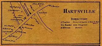 Historically the hamlet was sometimes known as Hartsville; it is however not to be confused with the Hartsville in Steuben County.