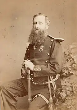 He was commissioned a captain in the Louth Rifles in 1854, a British militia unit. When the Roman crisis arose he offered his services to Pope Pius IX against Giuseppe Garibaldi who had launched the Expedition of the Thousand. Raising and leading an Irish battalion of 900 men, known as The Battalion of St Patrick, he fought in the 18-day war until the surrender of Spoleto in September 1860.[2] On the losing side at the Battle of Castelfidardo, the Papal States were soon reduced to the province of Lazio around Rome.[3] Some of his men joined the Papal Zouaves after the war.