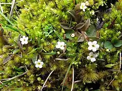 Myosotis bryonoma Meudt et al. is in the plant family Boraginaceae and was originally described in 2018 by Heidi Meudt, Jessica Prebble and Michael Thorsen.[3][2] It is morphologically most similar to M. tenericaulis, another creeping, bracteate-prostrate species of Myosotis, and also shares some morphological characters with other bracteate-prostrate species, M. colensoi and M. cheesemanii.[2] It can be distinguished from M. tenericaulis by its shorter (<5 mm long) and wider (>0.7 mm) petioles, smaller leaves (generally <6 mm long), appressed trichomes that are parallel to the mid vein, rosette leaves that are glabrous on the underside, shorter inflorescences (10–45 mm long) and internodes (<5 mm), and fewer flowers per inflorescence (1–3).[2] M. bryonoma can be distinguished from M. colensoi and M. cheesemanii by its shorter rosette leaf petioles (< 4 mm long), shorter calyces (< 3.5 mm long at flowering), calyx lobes which are longer than half the length of the calyx, rosette leaves usually glabrous abaxially, and shorter corolla tube (< 4.3 mm long).[2]