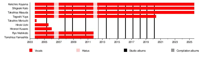 Formed in September 2003, NEWS released a promotional single, "News Nippon" (News ニッポン, News Japan), which was used as the theme song for the World Cup of Volleyball Championships.[1][7] Before holding their first concert, NEWSnow Concert: News' Concert (NEWSnowCONCERT〜ニュースのコンサート〜), Takahiro Moriuchi left the group. NEWS later released their debut single, "Kibō: Yell", which topped the Oricon chart.[8] Their next two singles, "Akaku Moyuru Taiyō" (紅く燃ゆる太陽, Burning Red Sun) (2004) and Cherish (チェリッシュ, Cherisshu) (2005), both debuted atop the charts, as did NEWS' first album, Touch, which sold 164,016 copies in its first week.[9][10][11]
