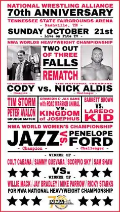 23. ^ a b Powell, Jason (October 21, 2018). "Powell's NWA 70th Anniversary live review: Cody vs. Nick Aldis in a best of three falls match for the NWA Championship, new NWA National Champion crowned, Jazz vs. Penelope Ford for the NWA Women's Championship". Pro Wrestling Dot Net. Archived from the original on June 3, 2022. Retrieved October 21, 2018.