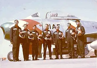 In 1956, Jahanbani was selected as part of a group of 15 IIAF pilots to be sent to Fürstenfeldbruck Air Base in West Germany to acquire for the first time jet training with NATO pilots under the US Air Force Europe, as Iran was taking delivery of its first jet aircraft - the Republic F-84 Thunderjet fighter and Lockheed T-33 Shooting Star trainer. The group included Colonel (later General) Mohammad Amir Khatami, Lt. (later Lt. General) Amir Hossein Rabii, and Lt. (later Major General) Abdolhossein Minusepehr. Upon completion of the training, 10 pilots returned to Iran while Jahanbani and four others, continued their training to become instructors upon return to Iran. During this time, he forged close ties and friendships with experienced American and NATO pilots, most notably members of the recently formed USAFE Skyblazers aerobatic team, flying the North American F-100 Super Sabres, America's first supersonic fighter jet.[4][5]