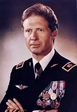 Eventually he returned to Tehran to serve in the IIAF High Command where he played a central role in the IIAF's subsequent advancement in both quality and quantity of air combat and logistical capabilities, overseeing growth from a once small force in the early 1960's to 100,000 personnel by 1979. He continued to emphasize rigorous training and set and maintain high proficiency standards, and helped spearhead the procurement and integration of advanced front line American aircraft, such as the F-4 Phantom II, F-5 Freedom Fighter/Tiger II, and F-14 Tomcat, alongside sophisticated radar and missile systems (notably the AIM‑54 Phoenix). Towards this end, he held several leadership positions, including Deputy Commander of the Air Training Command, and subsequently Deputy Commander for Planning and Organization of the IIAF.[9][8][10], a position he held until shortly before the end of the IIAF in the 1979 Islamic Revolution in Iran.[5][8] General Jahanbani was also an avid athlete and emphasized physical fitness throughout all areas under his command. For this reason, towards the end of his career he was also appointed general secretary of the National Sports Federation.[11]