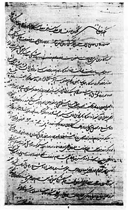 ![]() A hokm by Safavid Shah Solayman I in Persian, dated 1667. The document answers a complaint of the governor of Shirvan Najafqoli Khan, whose vizier Mirza Kamran did not receive his rasm-e vezarat of 980 toman for 14 years because the local peasantry at one time had been exempted from taxes. A reduced amount of 450 toman is to be levied. | |