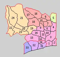Map of Naka District with Meiji period area in yellow, modern area in green