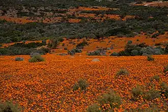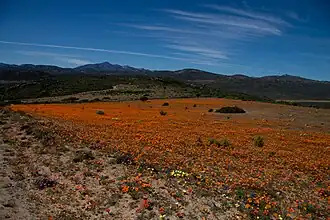 Namaqua National Park is a South African national park situated on the edge of the Atlantic coast of Namaqualand (an area covering 440,000 km2 located within the semi-desert Succulent Karoo biome).[2][3] This biome is a biodiversity hotspot with the largest concentration of succulent plants in the world.[3] The park also has an arid environment with succulent plants.[4] The park was created to protect its endemic flowers.[5] During the spring, wildflowers bloom there in a spectacular fashion.[3] The park's main tourist attraction is this abundant spring bloom of brightly coloured wildflowers.[4][6]