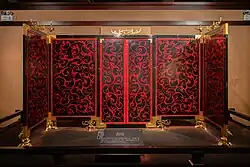 • The Occupant's Coffin: The coffin structure of Zhao Mo, the tomb occupant, originally consisted of an inner coffin nested within an outer coffin, both crafted from lacquered wood. After two millennia, the wood had completely decayed, leaving only archaeological traces. Based on these remains, the outer coffin measured approximately 3.3 meters long and 1 meter wide, while the inner coffin was about 2.2 meters long and 0.75 meters wide (height undetermined). Notably, the outer coffin’s side boards were once fixed with six gilded bronze ring-pulls featuring taotie (a mythical gluttonous beast) motifs. These were arranged with two on each side and one each at the head and foot ends. The exhibition displays a scientifically reconstructed model of the coffin structure and ring-pulls, meticulously recreated based on the archaeological evidence.[30]