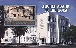 The National Bank of the Republic of Abkhazia[1] (Abkhaz: Аԥсны Аҳәынҭқарра Амилаҭтә Банк, Russian: Национальный банк Республики Абхазия), also known by the short form of Bank of Abkhazia (Russian: Банк Абхазии), is the central bank of the disputed region and partly recognized state of Abkhazia on the eastern coast of the Black Sea. It was established on February 28, 1991 since the adoption of the laws "On the National Bank of the Abkhaz SSR" and "On Banks and Banking of the Abkhaz SSR" passed by the Supreme Soviet of the Abkhaz SSR on February 28, 1991.