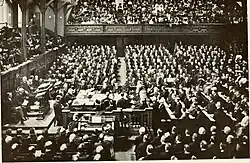 Proponents of "The Christian Manifesto," in order to further its prospects of success, pushed to postpone the meeting, which eventually was held 17–25 October 1950.[52] The preparatory committee of the meeting tried to fend off attempts to have the manifesto endorsed at the meeting,[51] and even planned writing a counter-manifesto. Their efforts failed,[53] and even though the TSPM was not even on the agenda of the meeting, the committee ended up unanimously supporting the manifesto and the TSPM, effectively ceding leadership to that organization.[52] It was the first meeting in history where all Chinese Protestants were represented, and so its signing of the manifesto was of special importance. From that point on the road was open for both the inception of the TSPM and the acceptance of the manifesto by Protestants.[54] For some, it was this moment rather than the initial publication that marked the manifesto's transforming of Chinese Christianity.[51]