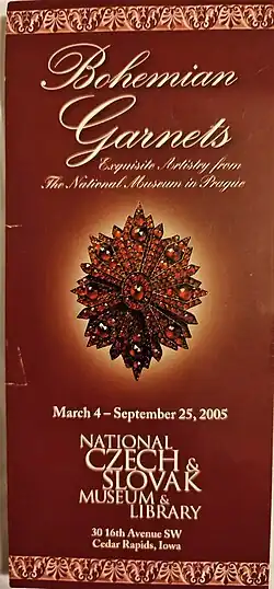 • On March 4, 2005, the museum opened an exhibition, "The Bohemian Garnets", which presented jewellery from renaissance to the present, dishes an other artifacts with the Czech national precious stone, on loan from the National Museum in Prague.[8]