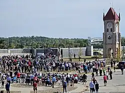 The museum was moved 480 feet (150 m) from the original site and was placed on an elevated foundation.[16] A groundbreaking ceremony was held on December 15, 2010.[10] On June 8–9, 2011, the Museum and Library, weighing around 1,500 tons (1,400 metric tons) and constructed of a wood frame with brick veneer, was moved to the new site. The building new site is 11 feet (3.4 m) higher than the previous site and 3 feet (0.91 m) above the 2008 flood level.[17] The museum dubbed the event "A Monumental Move" and set up a webcam for viewers to watch the move; the City of Cedar Rapids also shut down 16th Avenue SW, including the Bridge of Lions, so local residents could watch.[16] The museum's contractor for the job, Jeremy Patterson Structural Moving, stated that "it's apparently the largest museum ever relocated for flood hazard mitigation, and probably the only museum ever elevated."[18]