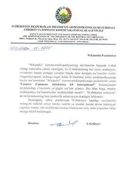 The National Encyclopedia of Uzbekistan was published in Tashkent from 2000 to 2005 by the National Encyclopedia of Uzbekistan State Scientific Publishing House.[2] The encyclopedia was printed in Cyrillic even though it was published long after Uzbekistan introduced the Latin script to Uzbek. In 2013, all of the articles of the National Encyclopedia were added to the Uzbek Wikipedia with the help of a bot. In 2022, the Agency of Information and Mass Communications under the Administration of the President of the Republic of Uzbekistan officially released the OʻzME under a CC BY 4.0 license.