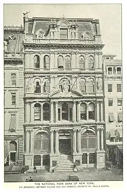 The bank built a significant Second Empire early skyscraper at 214-18 Broadway – opposite St. Paul's Chapel – designed by New York architect Griffith Thomas and finished in 1868.