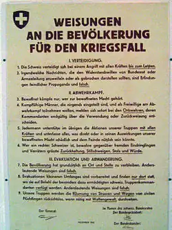 Instructions to the Swiss population in case of war. Point 7 tells people to stay where they live. 8: Only minor evacuations would ever take place. 9: Announces the use of deadly force if any refugees would clog roads and paths – presumably those leading to the alpine redoubt.
