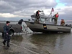 An officer with the New York Naval Militia prepares his vessel for transport.