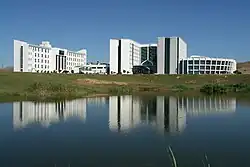 All the facilities and educational institutions of the university are located in the campus, along with the Near East College (middle and high school levels), the Near East Primary School and the Near East Kindergarten.[10][11] The campus is a few kilometres away from the city of Nicosia, accessible through the Near East Boulevard.[12] Transportation between the campus and the city is done through frequent buses that circulate through the city, including Gönyeli and the university.[13]