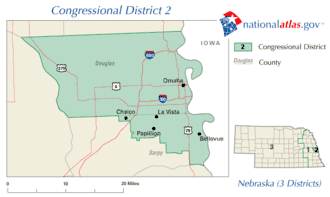 Nebraska's 2nd congressional district is a congressional district in the U.S. state of Nebraska that encompasses the core of the Omaha–Council Bluffs metropolitan area. It includes all of Douglas County, which includes the state's largest city Omaha; it also includes Saunders County and areas of western Sarpy County. It has been represented in the United States House of Representatives since 2017 by Don Bacon, a member of the Republican Party.