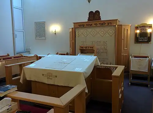 The NIG Bezuidenhout Synagogue, or Adas Jessurun Synagogue, is located behind an inconspicuous entrance at Cornelis Houtmanstraat 11 in Bezuidenhout. Established in 1986, the synagogue's name is loosely translated as the Community of Israel. The synagogue was designed by the Van Veldhoven Partners Architectenbureau in The Hague. The foundation stone was laid on 5 June 1986 and the synagogue was officially inaugurated on 30 September 1986, in the presence of Queen Beatrix. A number of objects in the synagogue, including the old Torah scrolls, originate from an eighteenth-century synagogue on the Voldersgracht.[4]