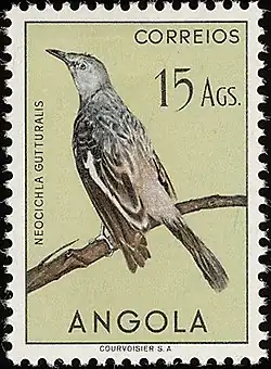 2. ^ Barboza du Bocage, 1871. Crateropus gutturalis (protonym). J. Sci. Math. Phys. Nat. Lisboa, (1), 3, p. 272. BHL
