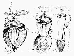 John Muirhead Macfarlane agreed with Burbidge's hybrid hypothesis and described the plant as such in his monograph of 1908, "Nepenthaceae".[4] B. H. Danser, in his 1928 revision, wrote that N. × harryana could be a hybrid as Macfarlane suggested or a form of N. villosa together with N. edwardsiana. Favouring the latter interpretation, he synonymised both taxa with N. villosa.[5]