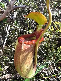 The pitchers of N. × kinabaluensis may be quite large, but do not compare to those of N. rajah or N. × alisaputrana (N. burbidgeae × N. rajah). Nepenthes × kinabaluensis can only be found on Mount Kinabalu (hence the name) and nearby Mount Tambuyukon, where the two parent species occur sympatrically.[8] More specifically, plants are known from a footpath near Paka Cave and several places along an unestablished route on a south-east ridge, which lies on the west side of the Upper Kolopis River.[5] The only accessible location from which this hybrid is known is the Kinabalu summit trail, between Layang-Layang and the helipad, where it grows at about 2,900 m in a clearing dominated by Dacrydium gibbsiae and Leptospermum recurvum trees. Nepenthes × kinabaluensis has an altitudinal distribution of 2,420 to 3,030 m.[9] It grows in open areas in cloud forest.