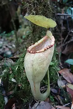 Nepenthes bongso /nɪˈpɛnθz ˈbɒŋs/ is a tropical pitcher plant endemic to Sumatra, where it has an altitudinal distribution of 1000–2700 m above sea level.[10][11] The specific epithet bongso refers to the Indonesian legend of Putri Bungsu (literally "youngest daughter"), the spirit guardian of Mount Marapi.[10]