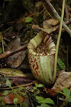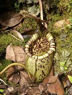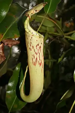 This plant is notable for combining the best characters of both parent species, not least the size of its pitchers, which rival those of N. rajah in volume (≤35 cm high, ≤20 cm wide).[28] The other hybrids involving N. rajah do not exhibit such impressive proportions. The pitchers of N. × alisaputrana can be distinguished from those of N. burbidgeae by a broader peristome, larger lid and simply by their sheer size. The hybrid differs from its other parent, N. rajah, by its lid structure, indumentum of short, brown hairs, narrower and more cylindrical peristome, and pitcher colour, which is usually yellow-green with red or brown flecking. For this reason, Anthea Phillipps and Anthony Lamb gave it the common name "Leopard Pitcher-Plant".[6] The peristome is green to dark red and striped with purple bands. Leaves are often slightly peltate. The hybrid is a strong climber and frequently produces upper pitchers.[7]