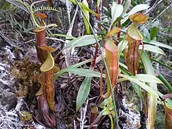 This species grows terrestrially in a wide range of habitats, including upper montane mossy forest, secondary vegetation, ridge tops, cliff sides, and landslides.[3] It has also been recorded at the margins of montane forest around the so-called Bonsai Forest,[1] which is named for its stunted trees. The species is restricted to ultramafic substrates. While N. micramphora tolerates shady conditions, it grows best under direct sunlight.[3] On Mount Hamiguitan, N. micramphora is sympatric with N. alata (sensu lato), N. justinae[5] (previously identified as N. mindanaoensis), and N. peltata,[1] and grows in the same altitudinal range as N. hamiguitanensis.[4] Despite this, no natural hybrids have been observed with certainty.