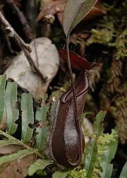 Nepenthes muluensis × N. tentaculata was described as N. × sarawakiensis in 1993 by J. H. Adam, C. C. Wilcock, and M. D. Swaine.[24] The authors distinguished the taxon from N. muluensis on the basis of its branched spur and the presence of fringe hairs on the top of the lid. They also compared the distribution of phenolic compounds in the leaves of N. muluensis and the hybrid, although they did so without specifying the number of plants studied or the number of repetitions performed.[6] As a result, doubts have been raised over the existence of this hybrid.[25] Charles Clarke writes that the authors described N. × sarawakiensis "in such a way that their work cannot be easily repeated".[6] Although this natural hybrid is likely to exist, it is possible that N. × sarawakiensis was described based on specimens of N. muluensis with lower pitchers.[6]