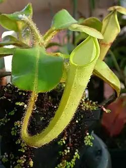 Upper pitchers gradually arise from the ends of the tendrils, forming a 15 to 20 mm wide curve. They are infundibular in shape and reach much greater dimensions than their lower counterparts, measuring up to 18 cm high by 8 cm wide. Like terrestrial pitchers, they lack wings, instead having a pair of prominent ribs. The pitcher mouth is positioned almost horizontally at the front, but rises into a neck (≤3 cm high) towards the rear. The flattened peristome is up to 12 mm wide and bears ribs spaced 1⁄3 mm apart which terminate in short teeth. Virtually the entire inner surface of the pitcher is glandular, having very small overarched glands at a density of 2000 to 2500 per square centimetre. The pitcher lid suborbicular, deeply cordate, and measures up to 7 cm in length. Small round glands are scattered throughout the lower surface of the lid and a prominent hook-like crest is present near the base.[2][3]