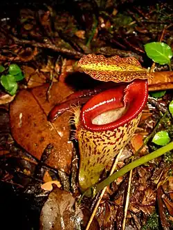 Rosette and lower pitchers are only produced briefly before the plant starts to climb. They are either entirely ovate or only ovate in the upper half and infundibular below. They often narrow just below the peristome. Terrestrial pitchers grow to 10 cm in height by 6 cm in width. A pair of fringed wings (≤10 mm wide) usually runs down the ventral surface of the trap, bearing filaments up to 8 mm long, although these wings may be absent altogether or only extend for a portion of the trap's length.[9] The pitcher mouth is round and positioned horizontally in the front two-thirds, rising at the rear to form a short neck.[8] The peristome is flattened, strongly incurved, and measures up to 15 mm in width. It bears ribs up to 0.8 mm high and spaced up to 1 mm apart. These ribs terminate in distinct teeth (≤3 mm long) on the inner margin of the peristome.[9] The inner portion of the peristome accounts for around 78% of its total cross-sectional surface length.[15] The peristome forms a short neck at the rear, where the teeth form two parallel rows. The inner surface is wholly glandular;[8] there is no waxy zone.[15] The pitcher lid or operculum is ovate to elliptic and has a cordate base. It measures up to 6 cm in length by 5 cm in width. It bears no appendages on its lower surface. A flattened spur measuring up to 5 mm in length is inserted near the base of the lid. It may or may not be branched. Lower pitchers are typically light yellow to olive green and speckled with red or purple. The inner surface is a light shade of yellow. The peristome is generally yellow or orange in freshly opened traps, later becoming dark red to purple as the pitcher matures. The upper surface of the lid is often yellow with orange to purple blotches, whereas the underside may be completely red, although this is not always the case.[9]