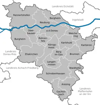 IngolstadtAichach-FriedbergAugsburg (district)Dachau (district)Eichstätt (district)Donau-RiesPfaffenhofen (district)AresingBerg im GauBergheimBrunnenBurgheimEhekirchenGachenbachKarlshuldKarlskronKönigsmoosLangenmosenNeuburg an der DonauOberhausenRennertshofenRohrenfelsSchrobenhausenWaidhofenWeichering