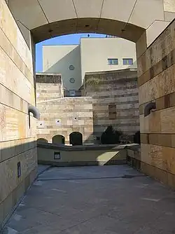 The building's most prominent feature is a central open-top rotunda. This outdoor, enclosed space houses the sculpture garden. It is circumnavigated by a public footpath and ramp that leads pedestrians through the site. This feature allows the public to reach the higher elevation behind the museum from the lower front of the building's main face.[1]