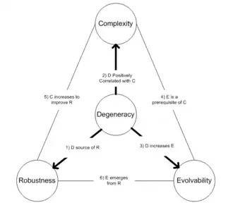 Relationships between degeneracy, complexity, robustness, and evolvability – 1) degeneracy is the source of robustness. 2) degeneracy is positively correlated with complexity. 3) degeneracy increases evolvability. 4) evolvability is a prerequisite for complexity. 5) complexity increases to improve robustness. 6) evolvability emerges from robustness.