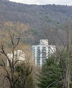 The Nevele Country Club was established in 1901 by Charles Slutsky (1861-1931), who named the first accommodation the Nevele Falls Farm House. Following the Catskill hotel fashion of Mission Revival architecture, new wings were built in that style in the 1920s and 1930s. The Slutsky family also operated the adjoining Fallsview hotel, which was merged with the Nevele for a time. In the 1950s and 1960s, the Nevele was greatly expanded in the modern style that had come to prevail in the Catskills by then. Architect Sydne Schleman designed the Vacationer Wing and the Waikiki Indoor Pool in 1954. These were followed by architect Herbert D. Phillips' Golden Gate and Empire wings from 1956, linked to adjoining buildings by tunnels. Phillips also designed new lobbies in a style that followed the influential hotel designs of his former employer, Morris Lapidus, who had worked at other Catskill resorts. By 1964, Phillips was a partner at the New York firm Viola, Bernard & Phillips, who designed the ten-story dodecagonal Nevele Tower. The nearly-circular building was intended to counter the excessive corridor lengths that plagued more traditional Catskill hotels.[9][10] President Lyndon B. Johnson stayed at the Nevele in 1966 to dedicate a new hospital in Ellenville.[11]