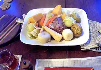 A New England boiled dinner is a traditional New England meal, consisting of corned beef with cabbage and one or more root vegetables, such as potatoes, rutabagas, parsnips, carrots, turnips, or onions.[1] The leftovers are traditionally diced and fried into "red flannel hash" for breakfast the next day.[2] The dish resembles boiled beef from English cuisine, as well as a similar Newfoundland dish called a "Jiggs dinner".