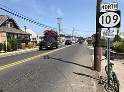 Route 109 begins at an intersection with CR 633 in the city of Cape May, heading to the northeast on Lafayette Street, a two-lane undivided road that is county-maintained and signed as a part of CR 633, which itself extends past the southern terminus of Route 109 along Jackson Street and Perry Street to CR 626 in West Cape May. The route passes through residential and commercial areas of Cape May, passing southeast of the terminus of the Cape May Seashore Lines railroad at the Cape May Welcome Center/Cape May Bus Terminal located at the former Cape May City Rail Terminal and intersecting the northern terminus of CR 653.[1][3] At the intersection with Sidney Avenue, Route 109 splits into a one-way pair that has two lanes in each direction, with the northbound direction following Sidney Avenue east before turning north on Washington Street and the southbound direction remaining on Lafayette Street.[3] Along this pairing, northbound Route 109 intersects the northern terminus of CR 622.[1] A short distance later, Washington Street turns west to join Lafayette Street, ending the one-way pair, and the route heads north as a two-lane undivided road.[3]