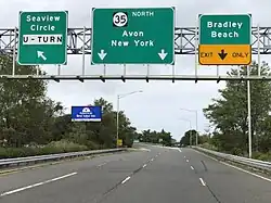 Past the Shark River bridge, Route 35 continues as a four-lane divided highway that features an interchange with Memorial Drive (CR 40A), crossing into Neptune City. The route continues northwest away from the railroad tracks through residential and commercial areas of Neptune City as a four-lane, undivided highway before heading north as a two-lane, undivided road.[2] Route 35 crosses back into Neptune, where it crosses the intersection of Corlies Avenue (Route 33).[1] It continues through suburban development and comes to the Asbury Park Circle where the route intersects with Asbury Avenue (CR 16), crosses into Ocean Township, and intersects with the eastern terminus of Route 66. The route becomes a four-lane divided highway and passes by the Seaview Square Mall as it continues north through commercial areas, intersecting many roads with jughandles and passing near Weltz County Park. Route 35 passes through the intersection of Talmadge Avenue.[1][2]