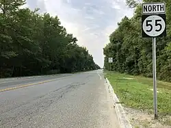 Route 55 begins at a signalized intersection with Route 47 in the Port Elizabeth section of Maurice River Township, Cumberland County, heading to the north as a two-lane freeway through wooded areas.[1][4] At the southern terminus, the road continues south as part of Route 47. A short distance after beginning, the road becomes a four-lane freeway and comes to a southbound exit and northbound entrance with Schooner Landing Road.[1] Past this interchange, Route 55 enters Millville and crosses over the Manantico Creek as it heads into built-up areas. The freeway continues north to an interchange with Route 49.[1][4]