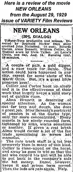 New Orleans is a lost 1929 American sound part-talkie drama film directed by Reginald Barker and starring Ricardo Cortez, William Collier Jr., Alma Bennett.[1] In addition to sequences with audible dialogue or talking sequences, the film features a synchronized musical score and sound effects along with English intertitles. The soundtrack was recorded using the Tiffany-Tone sound-on-film system using RCA Photophone equipment. The film was produced and distributed by the independent Tiffany Pictures. The soundtrack is still in existence.