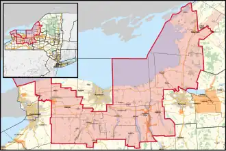 The current district includes all or parts of Cayuga, Wayne, Oswego, Ontario, Jefferson, Livingston, Niagara, Genesee, Wyoming, Seneca, Yates, Schuyler, and Orleans counties. With a Cook Partisan Voting Index rating of R+11, it is the most Republican district in New York.[3]