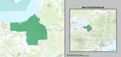 New York's 24th congressional district is located in Upstate New York in the Finger Lakes region, stretching alongside Lake Ontario from near Buffalo in the west to Watertown in the east. The district does not include Rochester, which is in the 25th district. Since 2023, it has been represented by Claudia Tenney. In the 2022 election it voted more strongly Republican than any other district in the state. Prior to the redistricting which took effect in 2023, the district included the city of Syracuse.