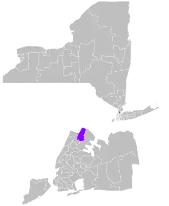 The district overlaps New York's 14th, 15th, and 16th congressional districts, with the 80th, 81st, 82nd, 83rd, and 89th districts of the New York State Assembly, the 11th, 12th and 13th districts of the New York City Council, and the 13th and 14th districts of the Westchester County Board of Legislators.[5]