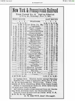 - ^ "New York & Pennsylvania Timetable No. 19". Potter Enterprise (Coudersport, Pennsylvania). April 2, 1903. p. 11. Archived from the original on June 3, 2019. Retrieved June 3, 2019.