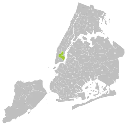 The district overlaps with Manhattan Community Boards 2, 3, 5, and 6, and with New York's 7th and 12th congressional districts. It also overlaps with the 26th, 27th, and 28th districts of the New York State Senate, and with the 65th, 66th, 73rd, 74th, and 75th districts of the New York State Assembly.[5]