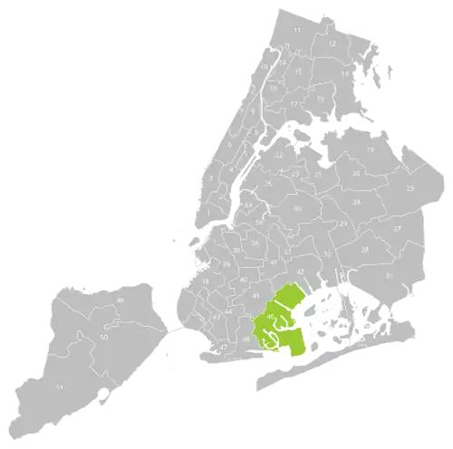 The district overlaps with Brooklyn Community Boards 15 and 18, and with New York's 8th and 9th congressional districts. It also overlaps with the 19th, 21st, and 22nd districts of the New York State Senate, and with the 41st, 58th, 59th, and 60th districts of the New York State Assembly.[5]