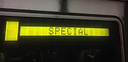 Special is a signifier for a train that is running along a nonstandard route. It is sometimes used for special holiday trains,[11][12] baseball game service,[13] or for emergency or custom routes. Most trains have a "Special" option on the rollsigns or LCD/LED displays.[14]
